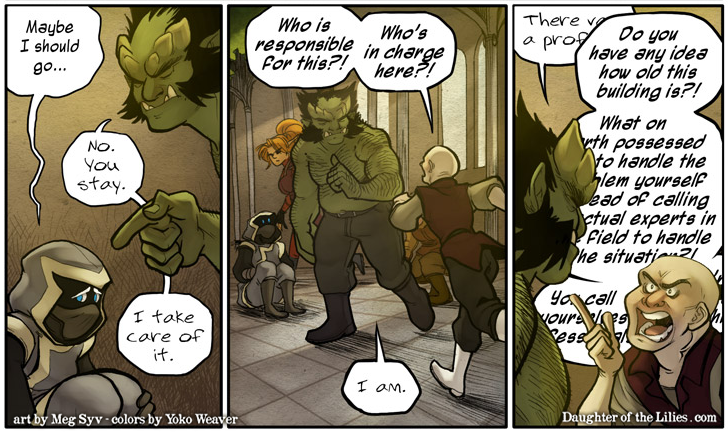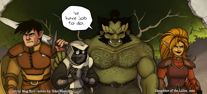 The comic itself came to my attention earlier in the year and, while not focusing on orcs, one of the main characters is an orc, and another is a quarter-orc. The cast itself consists of a human, an elf, and the orcs. The art is lovely and the colors (provided by Yoko Weaver) really pop. The story’s been interesting and really picking up as of late. So, without further ado, Meg!