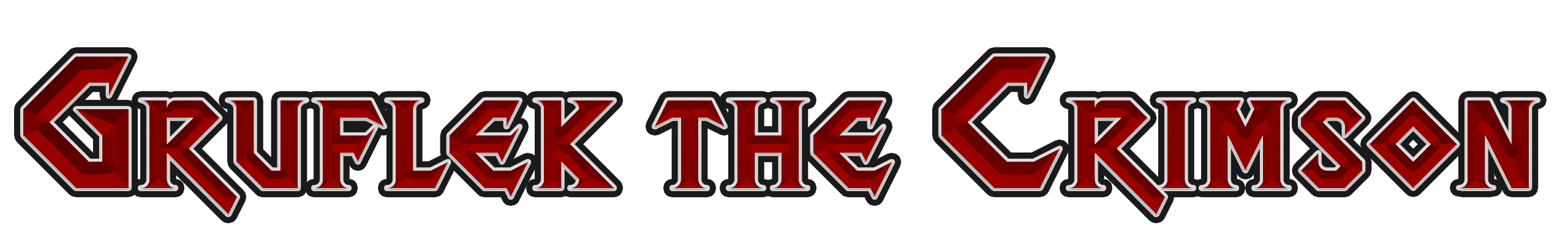"Gruflek the Crimson" logo in an angular red font with a double outline of white and charcoal.